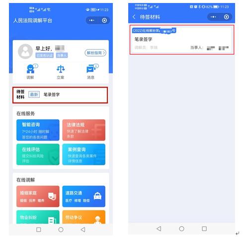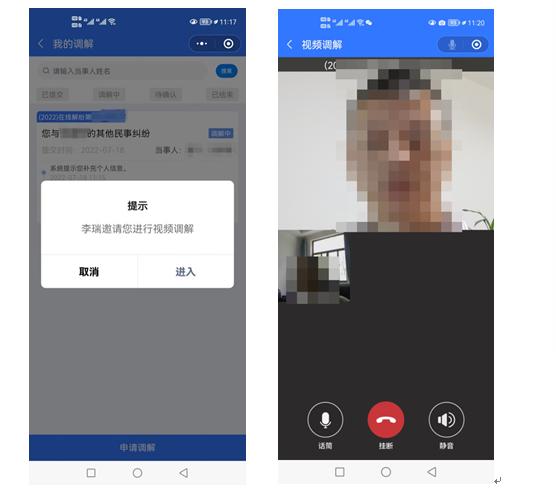 7、在线调解。调解员发起视频邀请,当事人登录“多元调解”小程序参与视频调解。调解过程中,调解员在线制作笔录/协议,当事人可在“多元调解”小程序“待签材料”模块查看,对笔录/协议内容无异议的可进行“确认并签字”。
