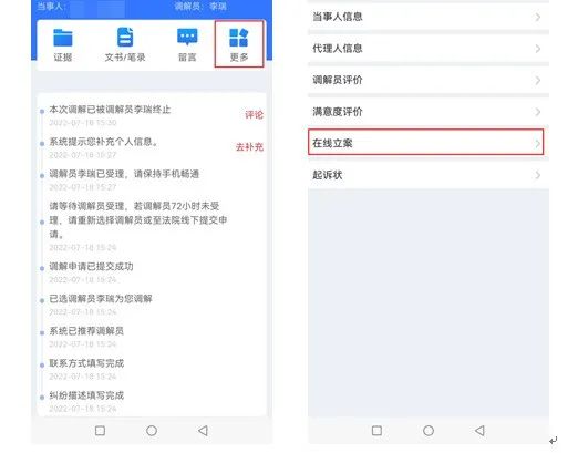 在案件详情中点击右上角 “更多”选择“在线立案”