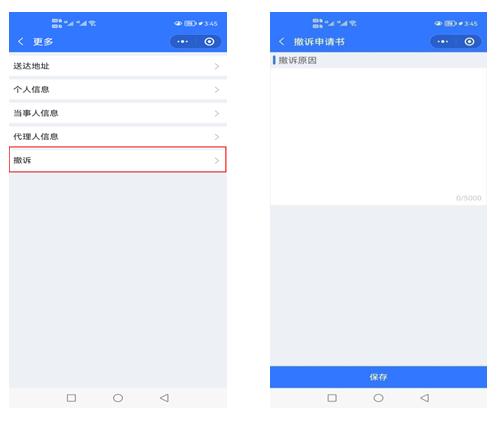 8、在线立案撤诉。立案后,若想撤销立案,可以在“人民法院调解平台”小程序首页“立案”板块中找到相关案件,点击 “更多”,选择“撤诉”,说明撤诉原因即可完成撤诉。