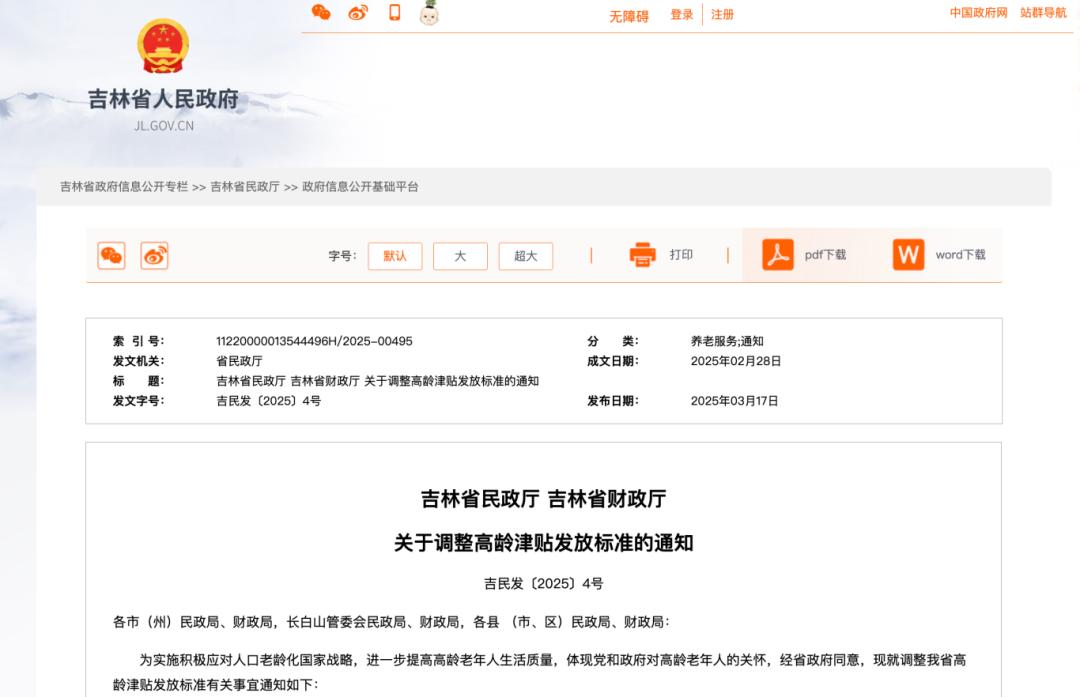 原文标题:吉林省民政厅 吉林省财政厅 关于调整高龄津贴发放标准的通知