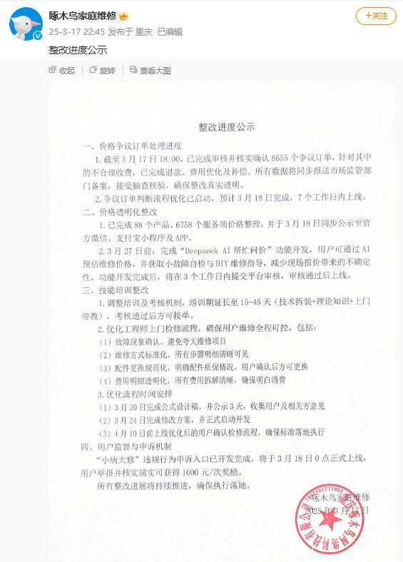 3月16日,啄木鸟再道歉,发布《整改承诺书》:即日起,我们将全面推进整改措施,接受全民监督。针对近期价格争议订单,平台将分阶段核查,首批处理平台维修保修期内投诉的订单,平台将主动联系用户进行无条件全额退款。对于经核实存在欺诈收费、恶意误导用户的维修工程师,将列入平台黑名单,永久禁入。任何用户发现“先维修后报价”“强制收费”“夸大维修”等违规行为,均可举报,核实属实即奖励1000元/次并保密举报人个人隐私。