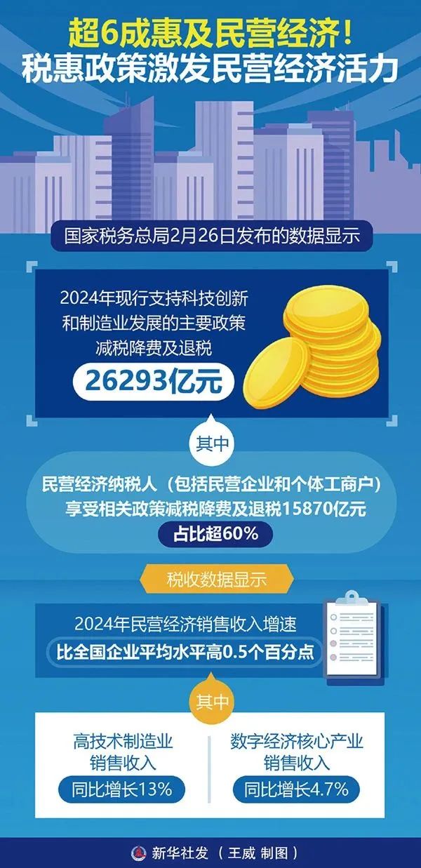 党的十八大以来,各地区各部门从减税降费、市场准入、融资支持等方面出台系列政策举措,有力促进民营经济发展壮大。根据国家税务总局2025年2月26日发布的数据,2024年现行支持科技创新和制造业发展的税惠政策超六成惠及民营经济。 新华社发 王威/制图深刻阐明当前促进民营经济发展的工作重点。习近平总书记强调,扎扎实实落实促进民营经济发展的政策措施,是当前促进民营经济发展的工作重点,并围绕解决民营企业反映比较集中的问题,从5个方面作出具体部署。这些重要部署体现了习近平总书记抓民营经济政策落实一以贯之的鲜明态度和导向原则:突出公平原则,强调要坚决破除依法平等使用生产要素、公平参与市场竞争的各种障碍,持续推进基础设施竞争性领域向各类经营主体公平开放,继续下大气力解决民营企业融资难融资贵问题;突出法治理念,强调要强化执法监督,集中整治乱收费、乱罚款、乱检查、乱查封,切实依法保护民营企业和民营企业家合法权益;突出实干实效,强调要认真落实各项纾困政策,提高政策精准度,注重综合施策,对企业一视同仁。我们要认真落实习近平总书记的重要指示要求,结合工商联职责,推动政策落地见效,为民营经济高质量发展破冰除障、赋能加油、保驾护航。