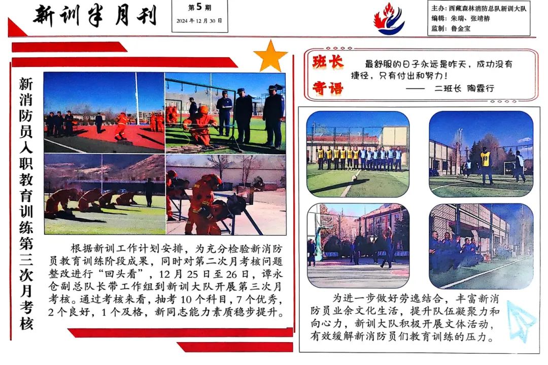 政治铸魂,雪域高原铸就忠诚品格针对西藏特殊的政治生态,新训大队打造“两路精神+老西藏精神”双引擎教育模式,将总队“四极精神”和森林队伍“火场精神”贯穿全程。通过邀请西藏大学教授、反诈民警等开展专题授课10余次,根据藏族新消防员特点实施“日学十字、周练百字”计划,帮助51名藏族同志提升汉语水平。组织参观“两路精神”纪念馆等红色教育基地8次,观看《志愿军》等红色影片10部,在党建基地重温入队誓词,让“扎根高原、奉献边疆”的信念深入人心。文化育人工程成效显著,创办《新训半月刊》9期,打造“训练龙虎榜”“新蓝风采墙”,开展“红色故事接力讲”等活动42场次。通过“家队共育”机制,建立家长微信群推送动态80余条,组织“家书寄情”“工资寄回家”等活动,成功化解思想矛盾,实现全员思想稳定。