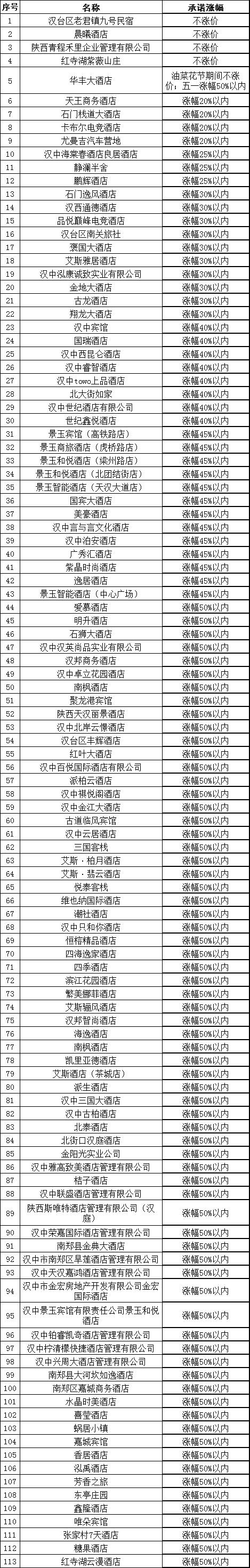 汉中,这座充满魅力的历史文化名城,以独特的自然风光和深厚的文化底蕴,热忱欢迎每一位远方来客。2025最美油菜花海汉中旅游文化节及五一假期将至,为维护旅游市场价格秩序,保障消费者合法权益,营造良好的旅游消费环境,全市各级市场监管部门和消协组织积极引导酒店行业综合考量经营成本、市场供需和社会承受能力,合理定价、以诚待客,目前,汉台、南郑中心城区已有113家酒店、宾馆、民宿等经营主体主动响应并作出价格承诺。现将有关情况公示如下: