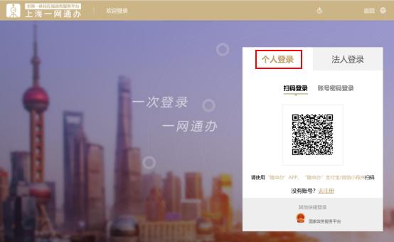 登录【一网通办】平台(网址:https://zwdt.sh.gov.cn),点击上方登录按钮,选择【个人登录】,通过【扫码登录】或【账号密码登录】。