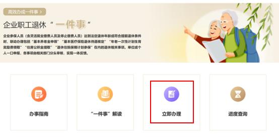 进入【企业职工退休“一件事”】页面后,选择【立即办理】申办业务;可查看【办事指南】【“一件事”解读】【进度查询】。