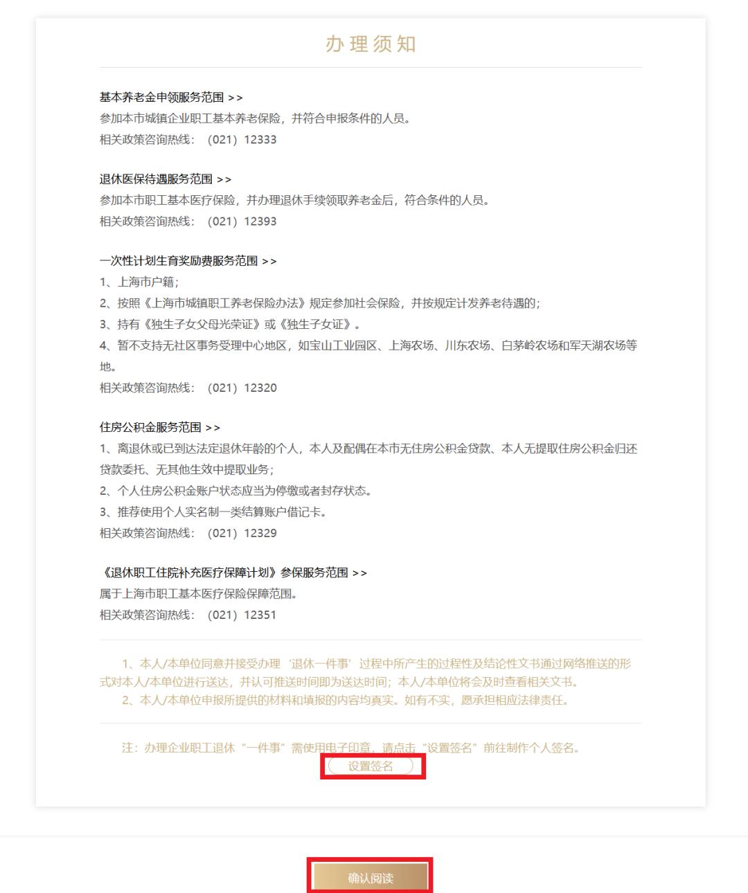 选择【立即办理】后,进入【办事指南】页面,阅读完毕后,点击【立即办理】按钮进入【办理须知】页面,点击【确认阅读】按钮进入【信息填报】页面。申领人如未在一网通办平台中设置过个人电子签名的,应先点击【设置签名】进行个人签名设置。