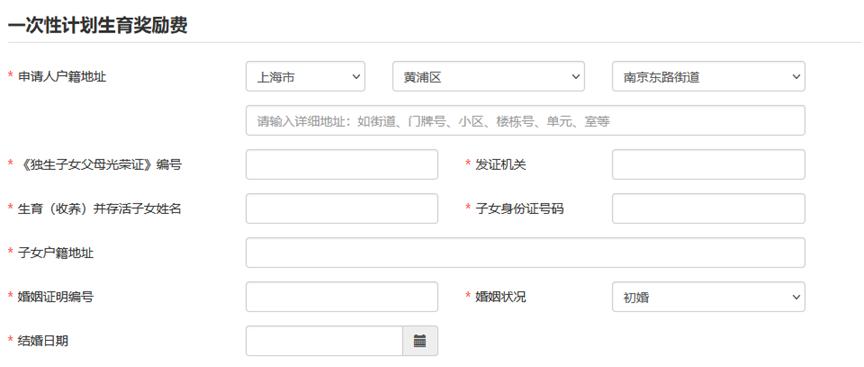 若选择申办【年老退休一次性计划生育奖励费】,系统会显示相关填报信息,根据提示进行填报。