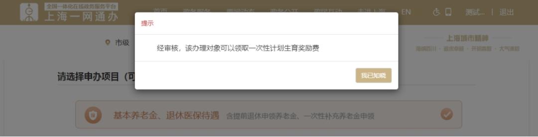 注:若已通过其他渠道先行完成年老一次性退休奖励费审核的,系统将直接显示审批结果:“经审核,该办理对象可以领取一次性计划生育奖励费”,点击【我已知晓】按钮可以继续填报其他信息。
