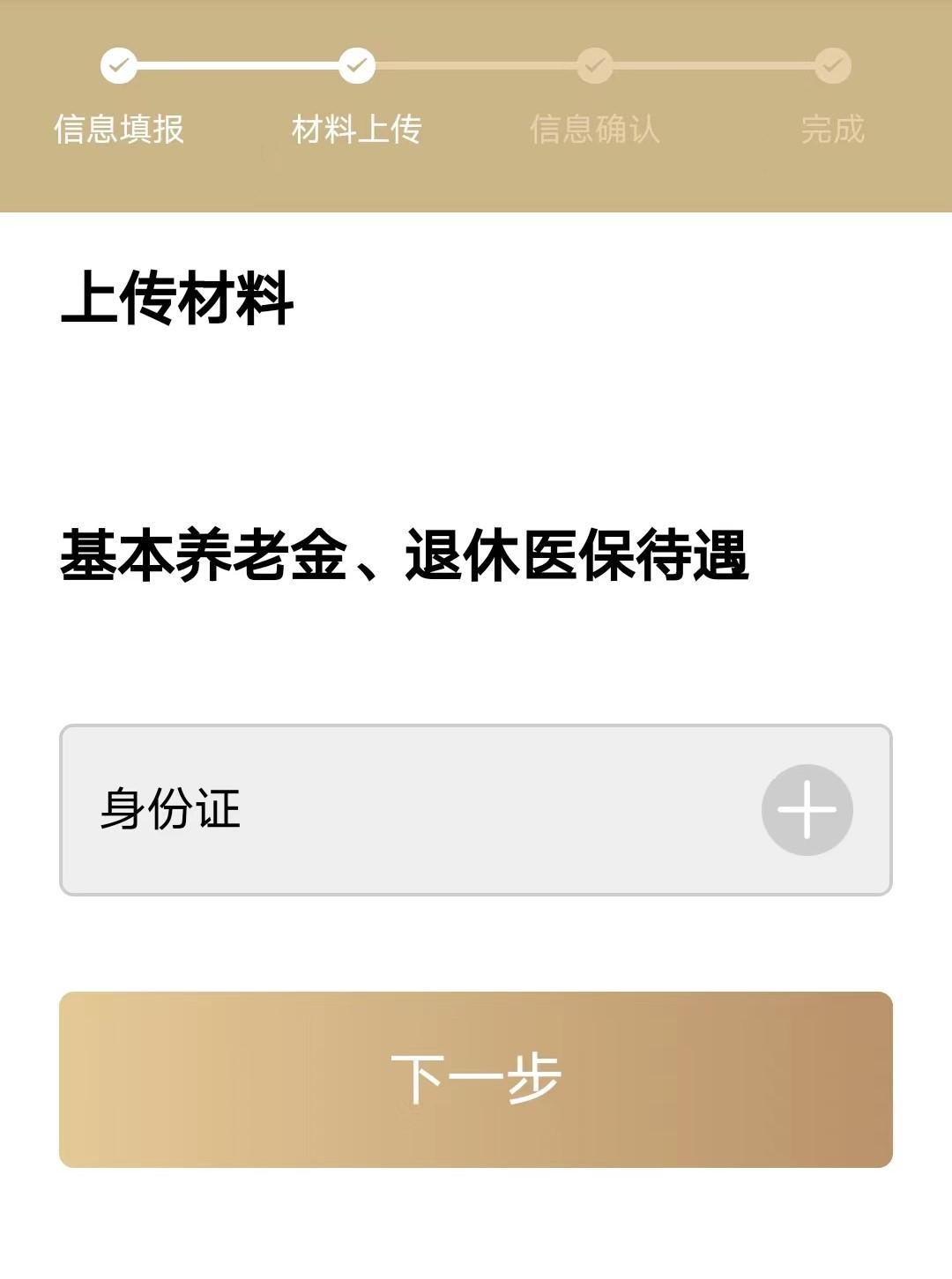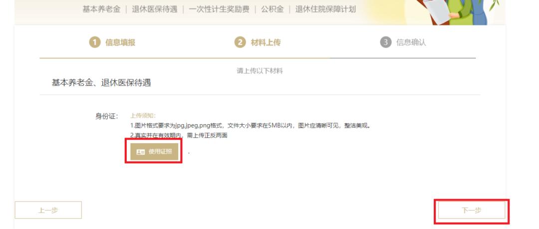 信息填报完成后,点击【下一步】按钮,进入【材料上传】页面。