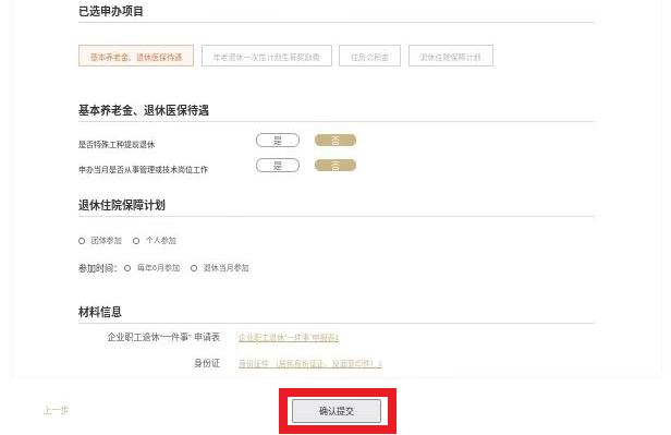 基本信息填写无误后,继续选择需要申报的项目。其中,【基本养老金、退休医保待遇】默认为必选项,【年老退休一次性计划生育奖励费】【住房公积金】【退休住院保障计划】可根据需求进行申报。