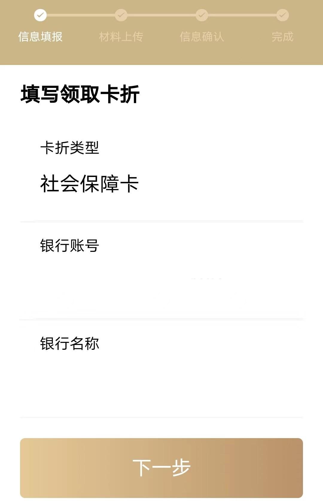进入【填写领取卡折】页面。填写申领人本人实名制银行账户信息,默认为第三代社会保障卡关联的银行账号;若未获取到其在本市社会保障卡信息的,可选择其他银行,银行账户类型须为一类结算账户。填写完成后,系统会对银行账号有效性进行实时校验。