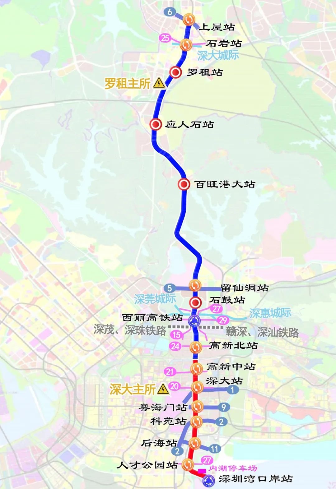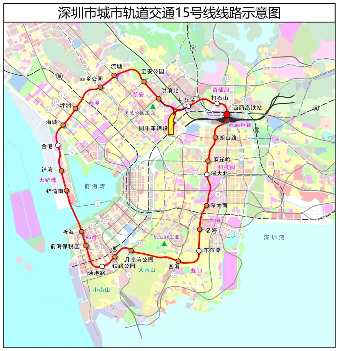 15号线起自听海路站,止于听海路站,全长32.2km,设24座车站、1座车辆段。线路建成后,将极大提升蛇口、高新北、留仙洞、宝安中心、西丽和未来科技城等片区的轨道交通服务水平。