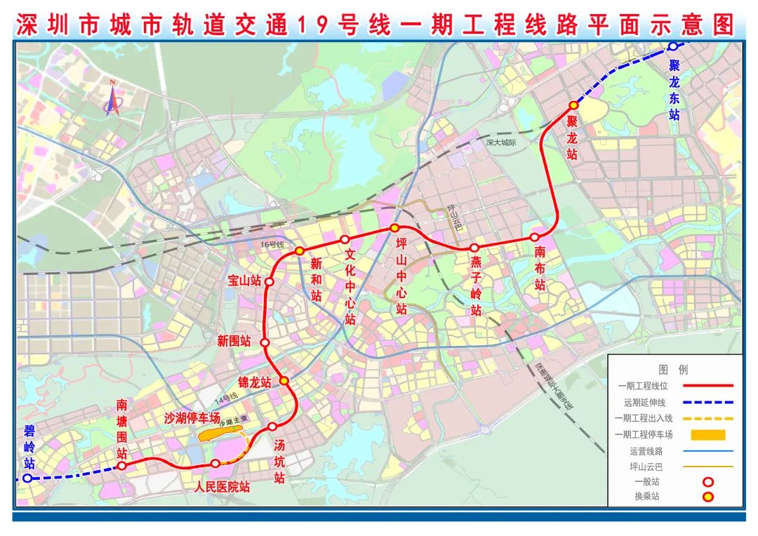19号线起于南塘围,止于聚龙站,线路全长约14.487km,共设车站12座,新建沙湖停车场一座,新建沙湖主变电所一座。采用全自动运行系统,车辆具备全自动驾驶(UTO)功能。线路连接坪山中心区、高新园区、碧岭等片区,并规划与多条轨道线路换乘,助力坪山构建"内联外畅"的交通网络。