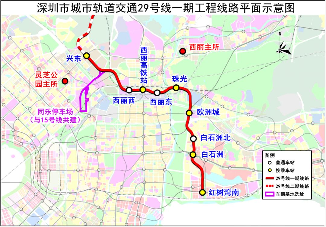 29号线位于南山至光明发展轴,起于红树湾南站,终于兴东站,全长11.16km,共设车站9座,全线均为地下敷设。线路建成后,将串联深超总、白石洲、西丽、石岩、光明科学城等片区和城市功能节点,进一步加强外围区域与城市核心区的联系功能。