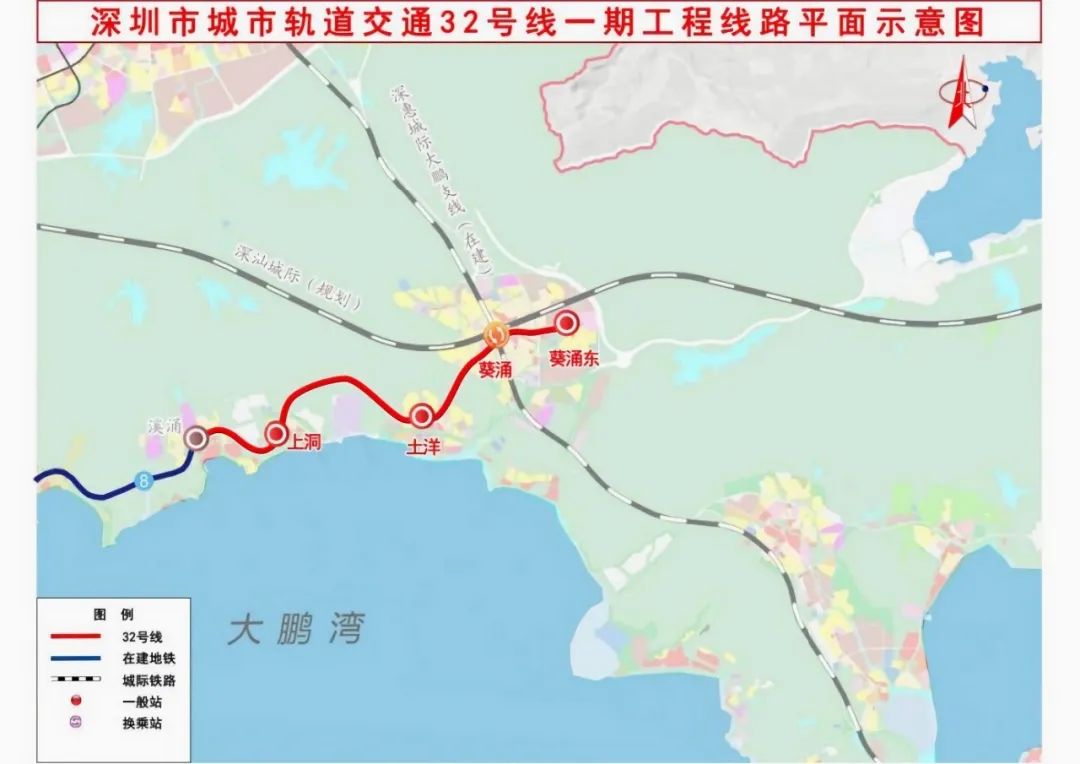 32号线起自8号线三期工程终点溪涌站(不含),终至葵涌东站,途经上洞—大鹏半岛自然保护区—土洋—葵涌等重要区域,线路全长约 9.53km。建成后将与2号线、8号线贯通运营,形成贯通南山、福田、罗湖、盐田和大鹏的轨道交通骨干线路,对大鹏新区建设世界级滨海生态旅游度假区具有重要支撑和促进作用。