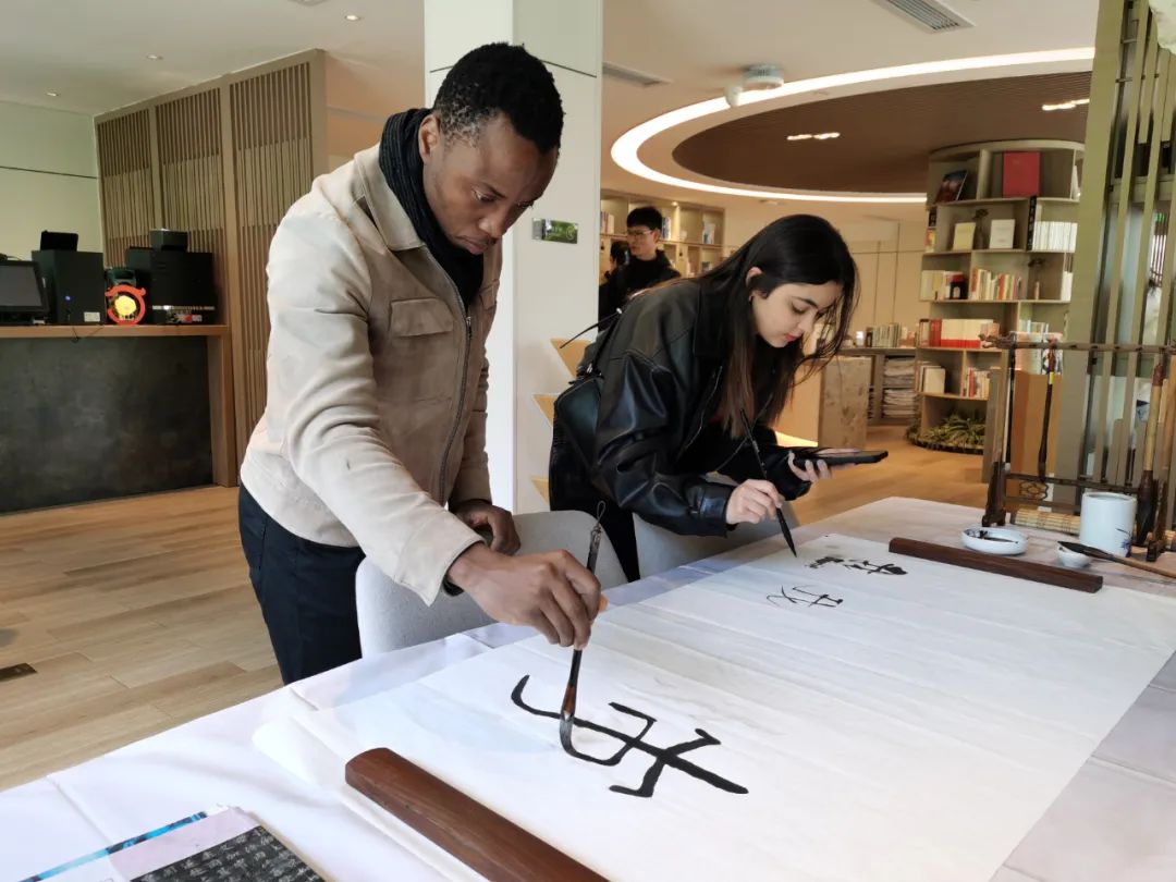 酒店的建筑和装饰融合了中式美学与人才主题元素,在一间书吧内,不少外籍博主和国际学生纷纷执笔挥毫,体验中国书法的韵味。