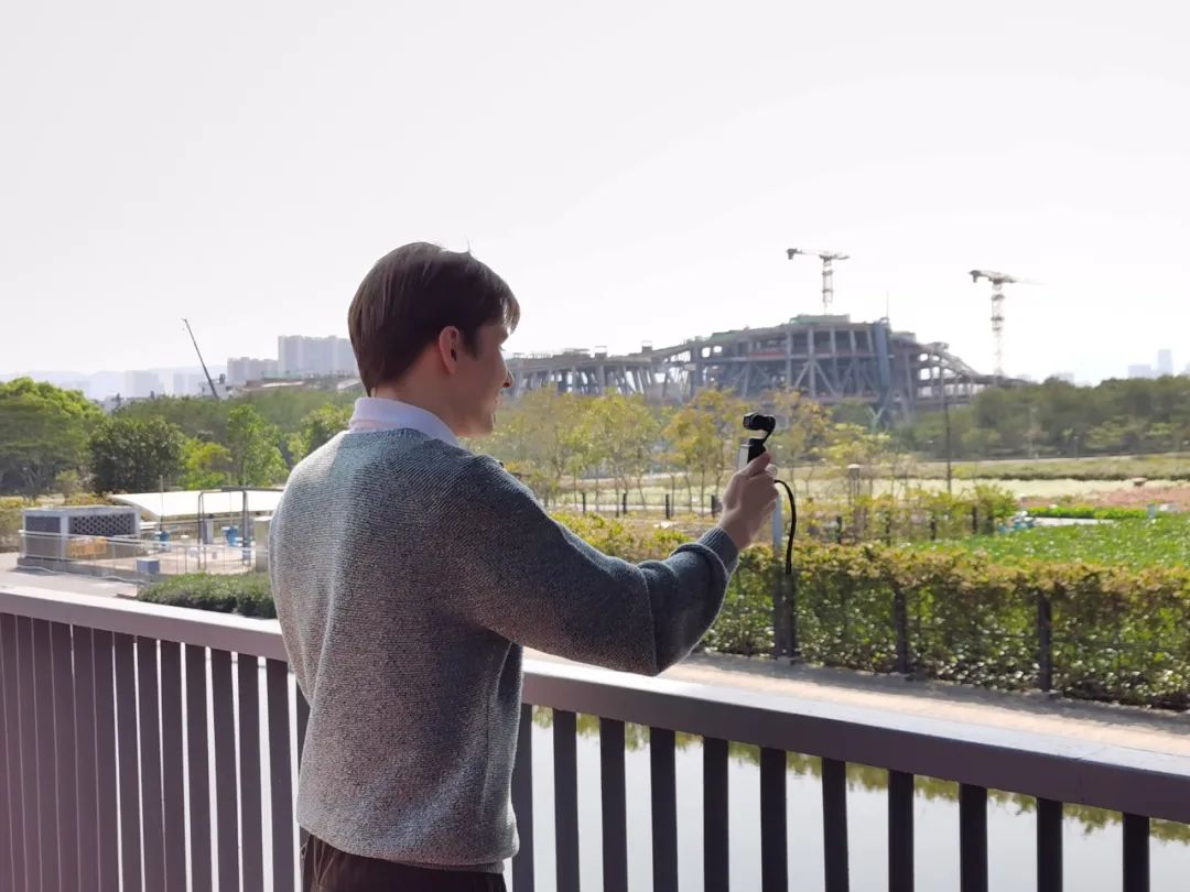 Fedor Kurilo records a video at the Nanbu Water Purification Station, with the under-construction Shenzhen Natural History Museum in the distance.俄罗斯学生费晨曦在南布水质净化站拍摄正在建设中的深圳自然博物馆。