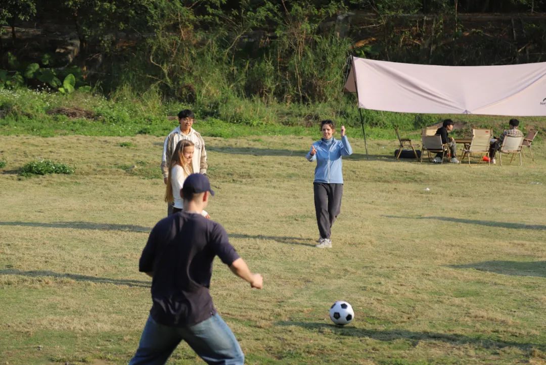 Tour participants play soccer at a campsite in Jingui Village.研学团成员在金龟露营小镇踢足球。