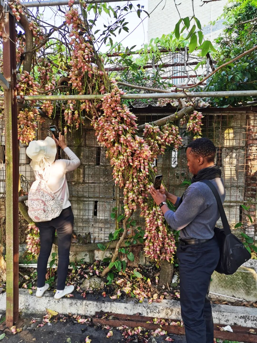 Tafadzwa Mackenzie Kadere (R)takes photos of the birdwood’s mucuna flowers in Jingui Village.Tafadzwa Mackenzie Kadere(右)在金龟村拍禾雀花。