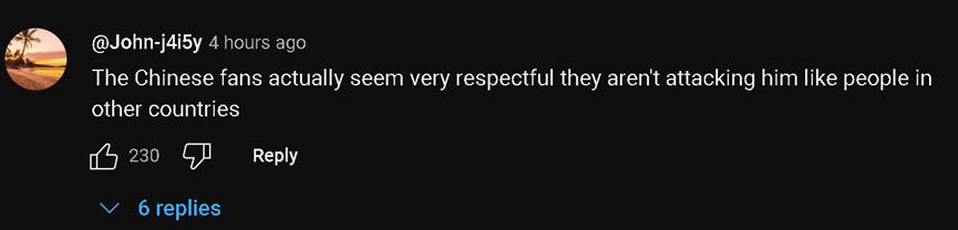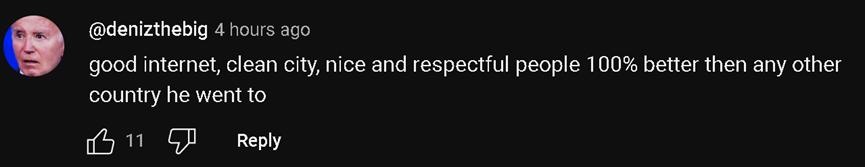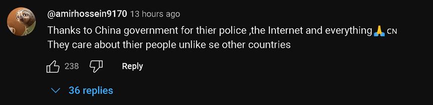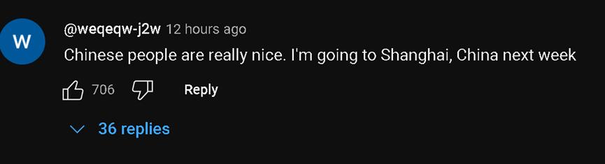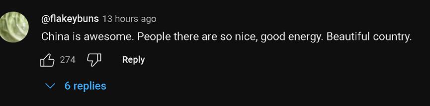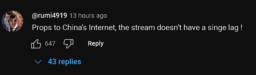不过,在观看他这场直播的外国网民中,他们的焦点除了中国民众的热情和友善,还有对中国网速的称赞。有网民还称,在“甲亢哥”去过的所有国家中,不仅中国人是最友善热情的,中国的市容市貌以及网速也都是最好的。