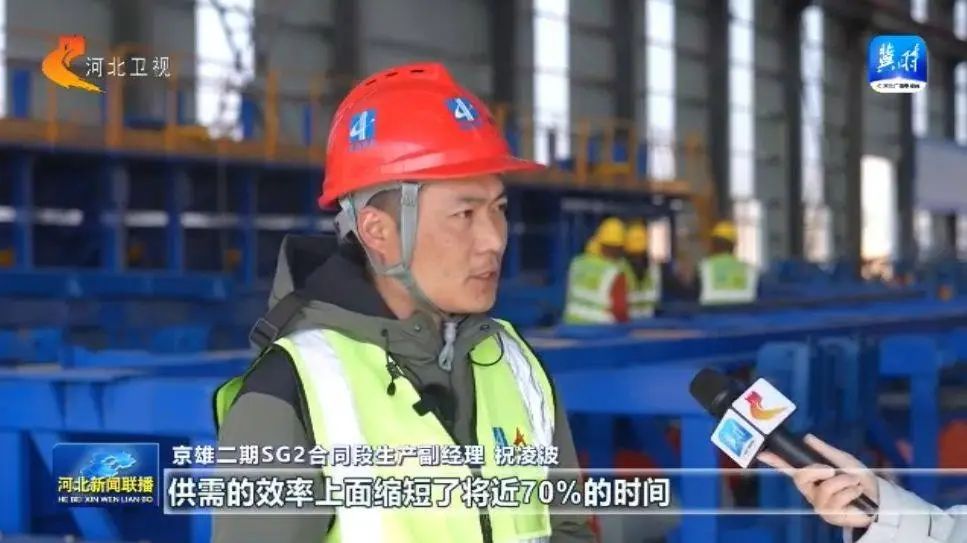 京雄二期SG2合同段生产副经理 祝凌波:供需的效率上面缩短了将近70%的时间。人工的话减少了40%的人工,通过这种工序或者工艺,从而大大提升了出梁的速度。由传统的7天变成了现在的2天至3天,对我们整个生产的进度提供了有力的保障。