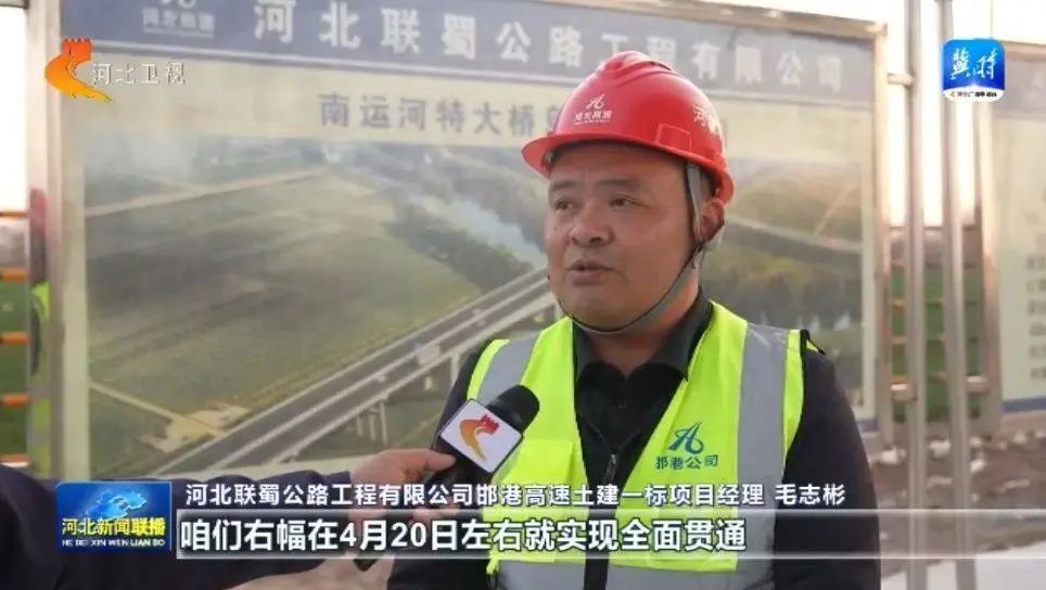 河北联蜀公路工程有限公司邯港高速土建一标项目经理 毛志彬:全长是1800多米,咱们两个主跨的宽度135米,咱们右幅在4月20日左右就实现全面贯通,左幅也在5月15日到5月20日之间也能实现一个全部贯通,为六月底通车打下坚实基础。