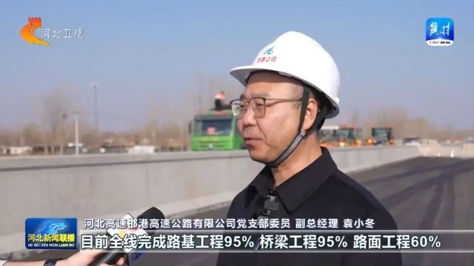 河北高速邯港高速公路有限公司党支部委员、副总经理 袁小冬:目前全线完成路基工程95%、桥梁工程95%、路面工程60%。我们正在进行沥青面层的摊铺工作,预计5月底完成全部路面工程,项目总投资是100.52亿元。目前已完成投资81亿元,占全部投资的80.52%。