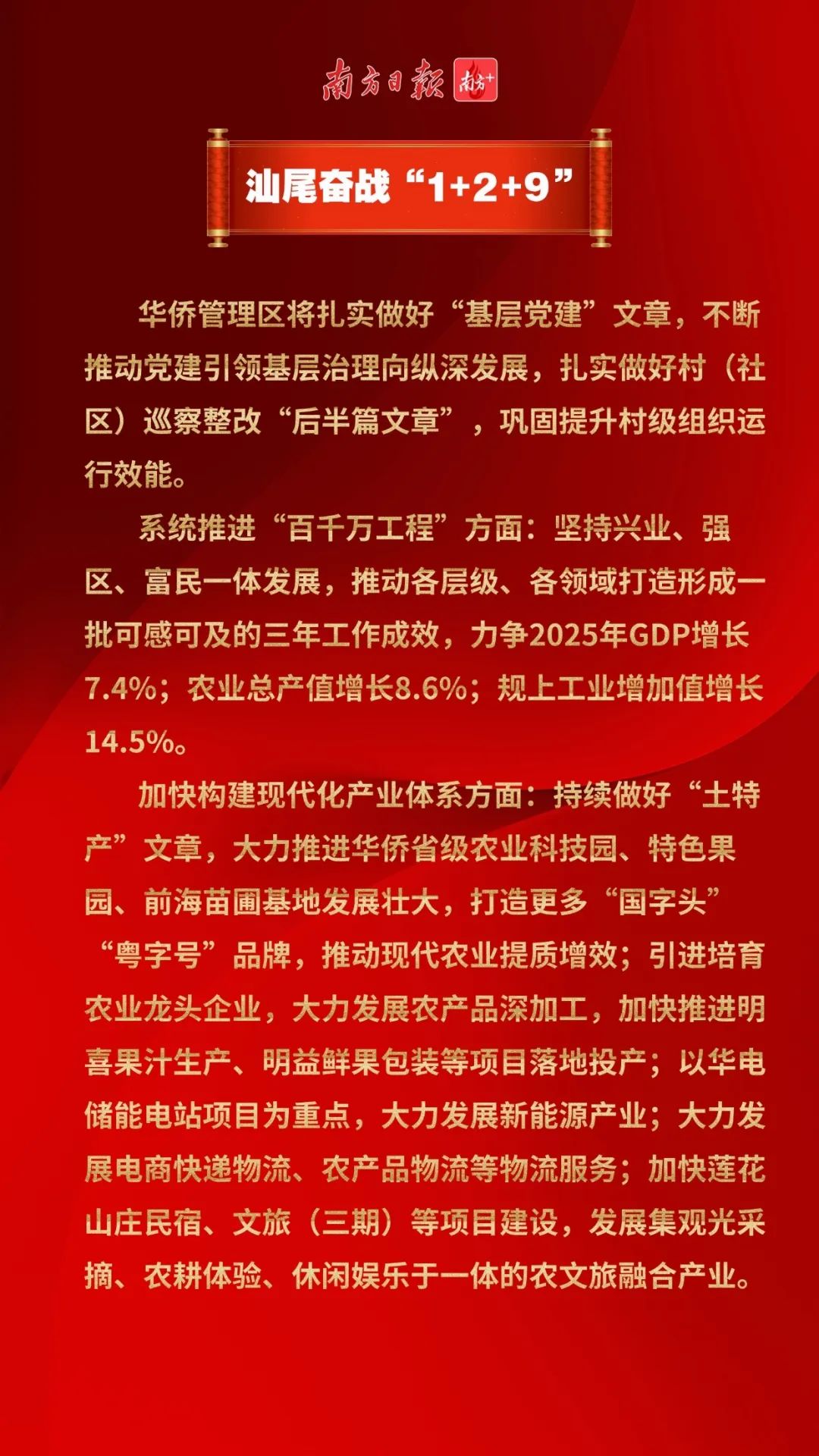 何为“1+2+9”?“1”是指狠抓基层党建这一基础保证,“2”是“百千万工程”和“现代化产业体系”两个关键牵引,“9”是开展“九大提升行动”,即开展“百千万工程”三年初见成效、招商落地、项目建设、产业园区品质、改革实效、平安基础、文明创建、民生保障、干部作风建设等九大提升行动。