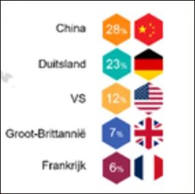 数据显示,德国仅次于中国,排名第二(23%)。美国占比为12%,排名第三。