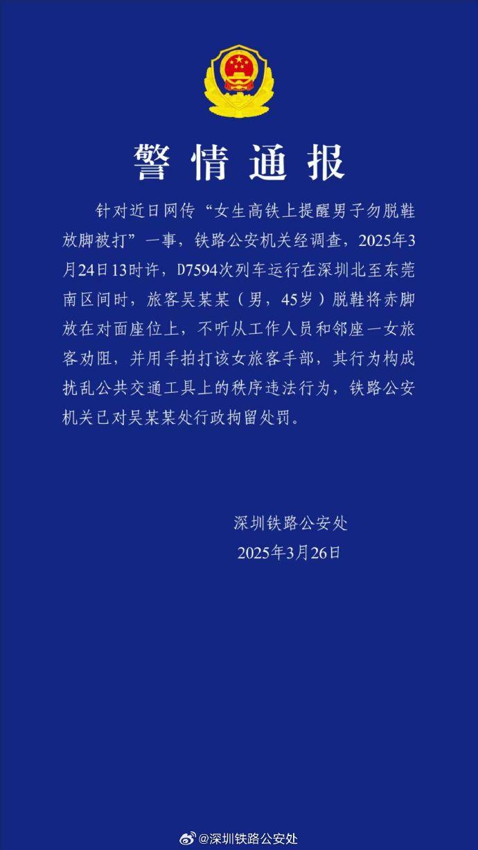 针对近日网传“女生高铁上提醒男子勿脱鞋放脚被打”一事,铁路公安机关经调查,2025年3月24日13时许,D7594次列车运行在深圳北至东莞南区间时,旅客吴某某(男,45岁)脱鞋将赤脚放在对面座位上,不听从工作人员和邻座一女旅客劝阻,并用手拍打该女旅客手部,其行为构成扰乱公共交通工具上的秩序违法行为,铁路公安机关已对吴某某处行政拘留处罚。