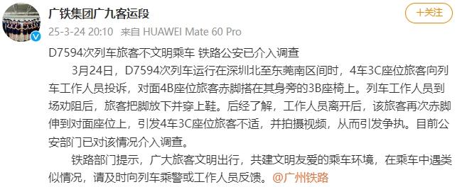 3月24日,D7594次列车运行在深圳北至东莞南区间时,4车3C座位旅客向列车工作人员投诉,对面4B座位旅客赤脚搭在其身旁的3B座椅上。列车工作人员到场劝阻后,旅客把脚放下并穿上鞋。后经了解,工作人员离开后,该旅客再次赤脚伸到对面座位上,引发4车3C座位旅客不适,并拍摄视频,从而引发争执。目前公安部门已对该情况介入调查。