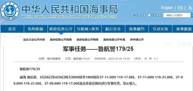 据中国海事局网站消息,潍坊海事局25日发布航行警告,3月26日至4月6日每天9时至18时,渤海潍坊港部分水域进行军事任务,禁止驶入。