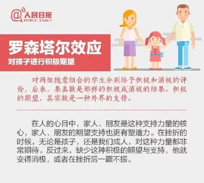 美国心理学家罗森塔尔对一所学校一到六年级18个班的学生进行了“未来发展趋势测验”,然后将一份“最有发展前途者”的名单交给了校长和老师,并嘱咐他们保密。8个月后,奇迹出现了:凡是上了名单的学生,成绩都有较大的进步,且性格活泼开朗,自信心强,求知欲旺盛,更乐于和别人打交道。有人可能对名单存在质疑,认为这些学生都是精挑细选出来的,然而事实真相却是,名单上的学生都是随机选出来的。因此,人们通常用这样一句话形象地说明罗森塔尔效应:"说你行,你就行;说你不行,你就不行"。要想使一个人发展更好,就应该给他传递积极的期望,积极的期望促使人们向好的方向发展。给父母的启示就是,“数子十过,不如奖子一功。”多给予孩子期望和鼓励,那将改变孩子的人生。03