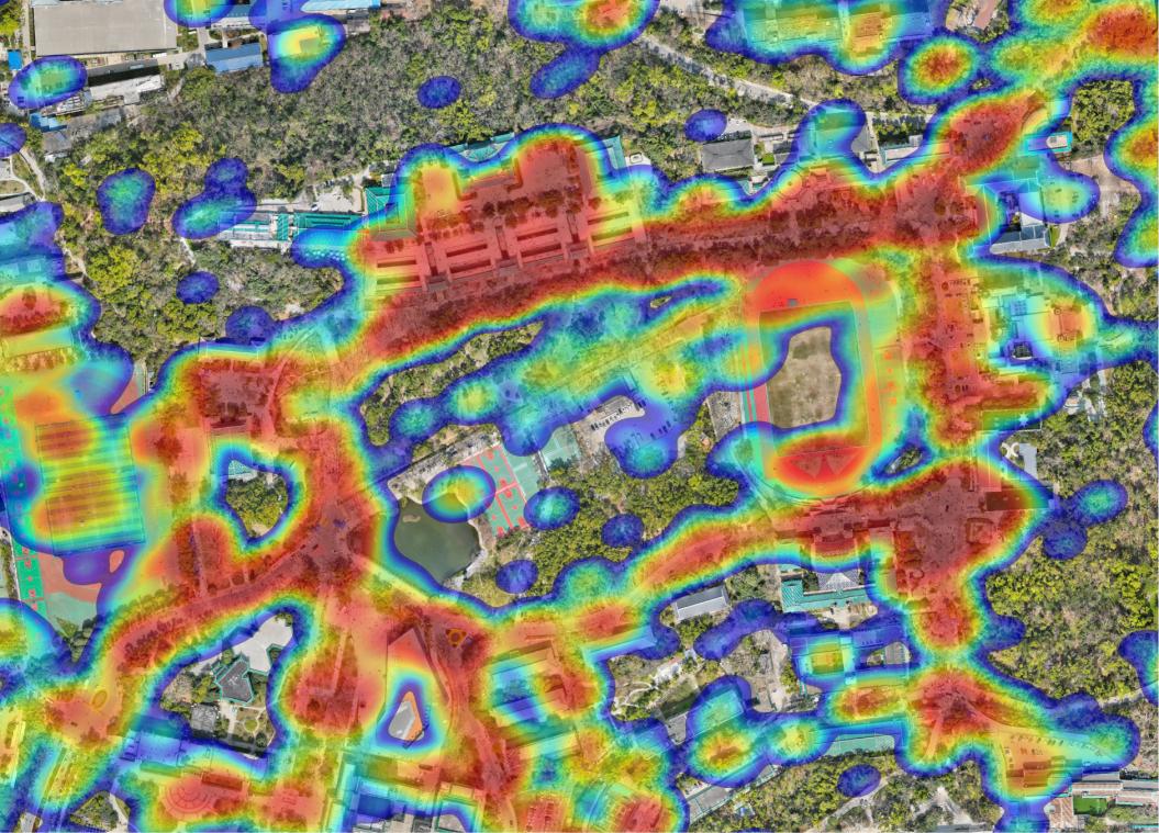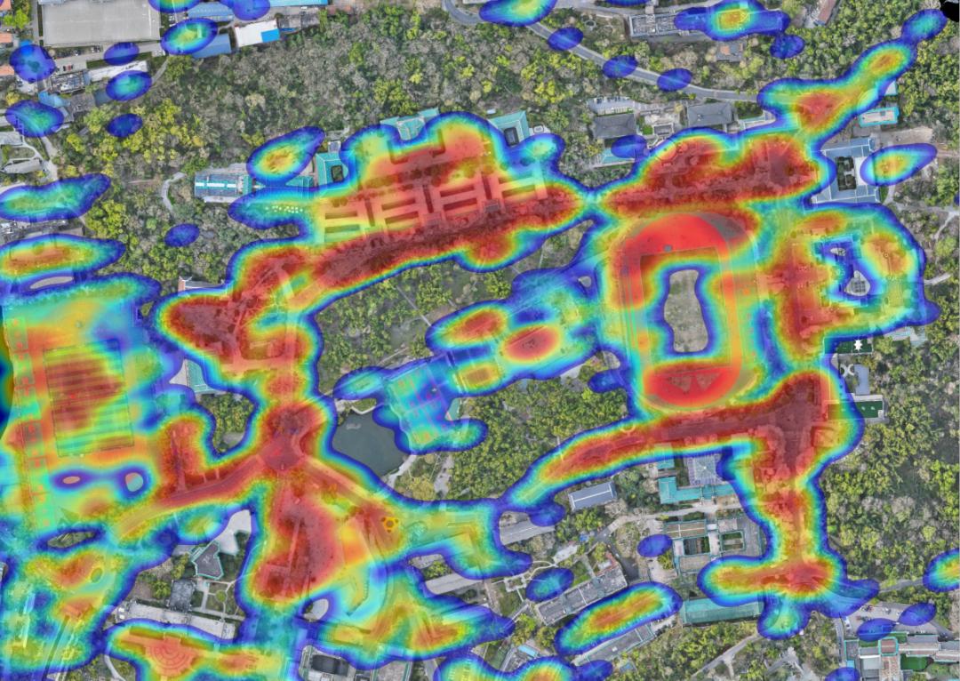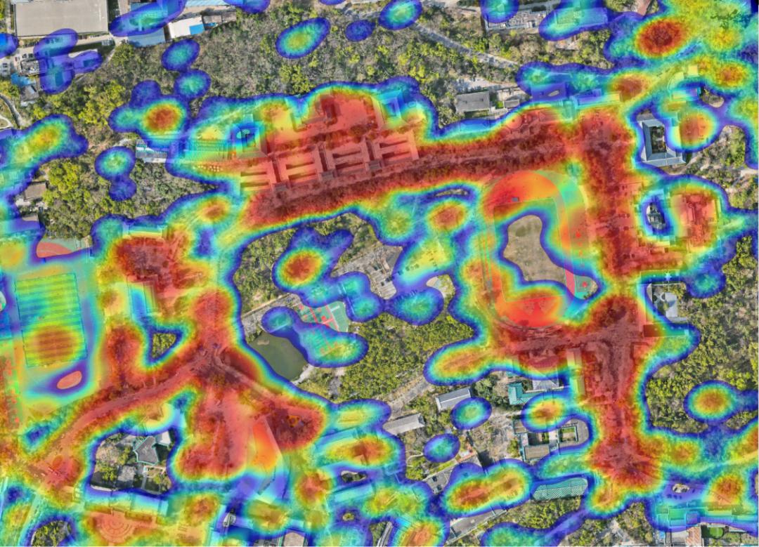 ▲从左至右依次为樱花季12点、14点、17点人流量分布热力图