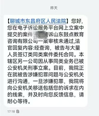 3月初,王芳收到聊城市东昌府区人民法院的短信答复,称其起诉山东鼓点教育一案审核未通过。东昌府区人民法院称:“经查询,被告与大量人员签订了同类案件委托合同。本辖区另一公司因从事同类业务已被公安机关刑事立案。目前,我院正在就被告涉嫌犯罪问题与公安机关进行沟通,一旦涉嫌犯罪,我院将向公安机关移送包括您的诉求在内的线索,并及时向您反馈信息,请耐心等待。”