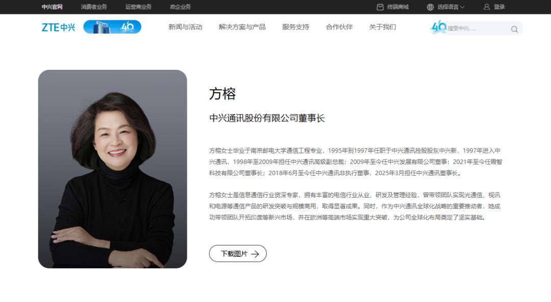 3月31日,中兴通讯发布公告,方榕当选新任董事长。这也是中兴通讯成立40年历史上首位女董事长。