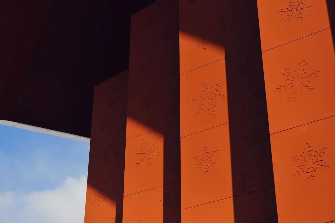 站房造型凸显浑厚的历史感。建筑色彩鲜明,暗喻红色之城;细部设计表达剪纸文化,远观有韵味、近赏有故事,抽象表达雪花、马兰花、枫树、通化民俗传说等地域元素及故事。