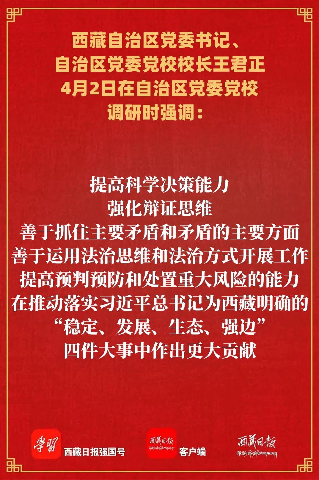 王君正强调,要坚持知行合一、学以致用,努力提高推进长治久安和高质量发展的能力和水平。提高政治能力,把“两个维护”作为最高政治原则和根本政治规矩,进一步深刻领悟“两个确立”的决定性意义,始终在思想上政治上行动上同以习近平同志为核心的党中央保持高度一致。提高科学决策能力,强化辩证思维,善于抓住主要矛盾和矛盾的主要方面,善于运用法治思维和法治方式开展工作,提高预判预防和处置重大风险的能力,在推动落实习近平总书记为西藏明确的“稳定、发展、生态、强边”四件大事中作出更大贡献。提高调查研究能力,弘扬“四下基层”优良传统,多到情况复杂、群众意见多、工作打不开局面的地方去,提出符合实际的工作思路和办法,更好推动工作落实。提高做群众工作能力,始终保持党同人民群众的血肉联系,自觉站在群众立场思考问题、分析问题,带着感情为群众解决问题,不断增强各族群众的获得感幸福感安全感。提高担当干事能力,知责于心、担责于身、履责于行,切实做到在其位、谋其政,努力创造经得起实践、人民、历史检验的业绩。提高狠抓落实能力,把分管工作牢牢抓在手上、落实到行动上,坚决防止把说了当做了、把做了一点当做了全部,确保党中央决策部署在西藏落地生根、开花结果。