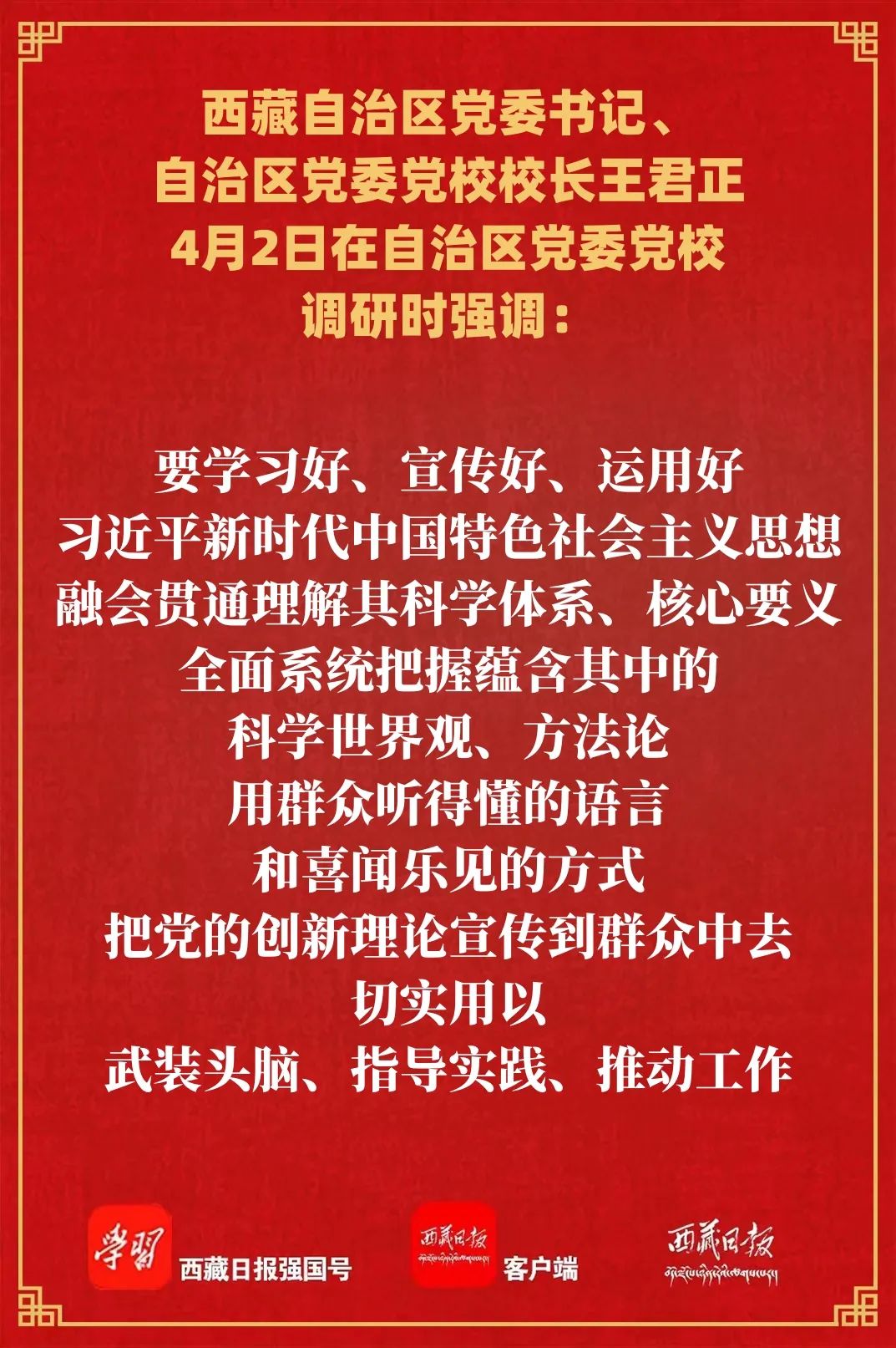 4月2日上午,自治区党委书记、自治区党委党校校长王君正在自治区党委党校调研,并与自治区党委党校学员、教职员工代表进行座谈。强调,要坚持以习近平新时代中国特色社会主义思想统揽党校工作全局,不断提高党校工作水平,努力建设忠诚干净担当的高素质干部队伍。