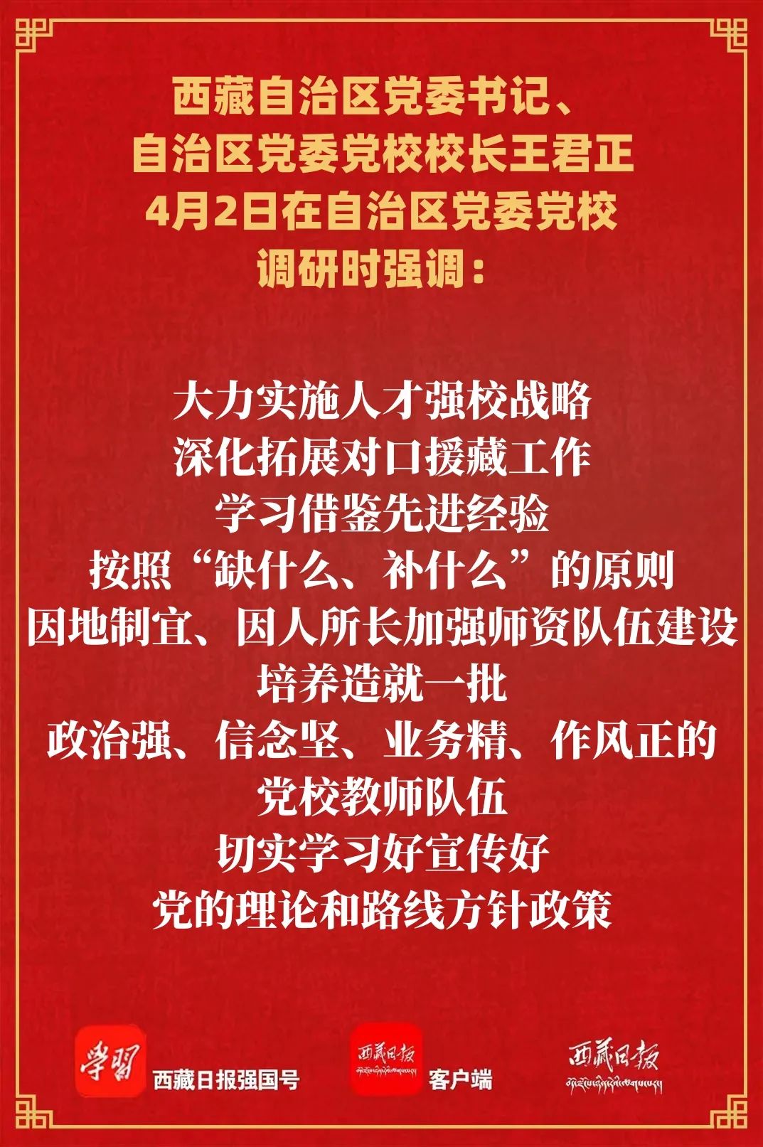 王君正强调,要坚持以习近平新时代中国特色社会主义思想统揽党校工作全局,不断提高党校工作水平,为建设社会主义现代化新西藏作出更大贡献。过去一年,自治区党委党校认真贯彻落实习近平总书记关于党校工作、西藏工作的重要指示和新时代党的治藏方略,扎实有效开展教育培训、科研资政,为西藏长治久安和高质量发展作出了贡献。要坚持党校姓党,宣传党的主张,高扬党的旗帜,始终同党中央保持高度一致,始终坚持党校正确发展方向。要坚持为党育才,高度重视、精心组织,有针对性开展党员教育轮训工作,增强培训实效性、科学性,努力培养造就高素质专业化干部队伍。要坚持为党献策,聚焦党之所需、政之所向、民之所盼,加强党的创新理论研究阐释工作,围绕制约西藏经济社会高质量发展的“人口、人心、人才”问题,形成更多高质量的研究成果,切实发挥好科研资政作用。要坚持从严治校、质量立校,加强师德师风教育,强化学员管理,以良好学风教风校风保证教育培训质量;大力实施人才强校战略,深化拓展对口援藏工作,学习借鉴先进经验,按照“缺什么、补什么”的原则,因地制宜、因人所长加强师资队伍建设,培养造就一批政治强、信念坚、业务精、作风正的党校教师队伍,切实学习好宣传好党的理论和路线方针政策。各级党委要大力支持党校事业发展,为党校开展工作创造良好条件。