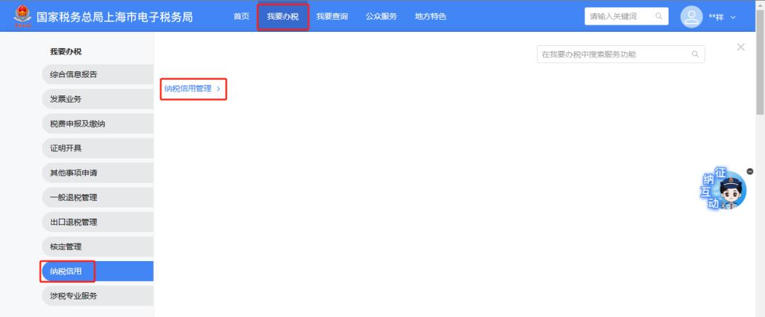 第一步:登录新电子税局后,点击【我要办税】 -【纳税信用】-【纳税信用管理】功能菜单。