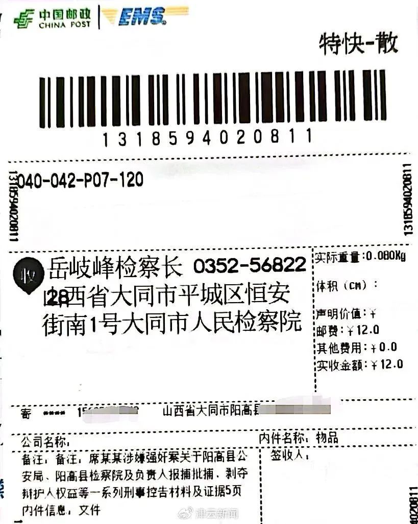 郑女士前往大同市人民检察院提交控诉材料郑女士告诉记者,她上交控诉材料时,要求大同市人民检察院出具收到控诉材料的证明,但检察院没有出具。“他们说是需要跟上级领导汇报,商量之后才能给我们一个答复。回家之后,我又向大同市人民检察院邮寄了一份控诉材料。”郑女士说。