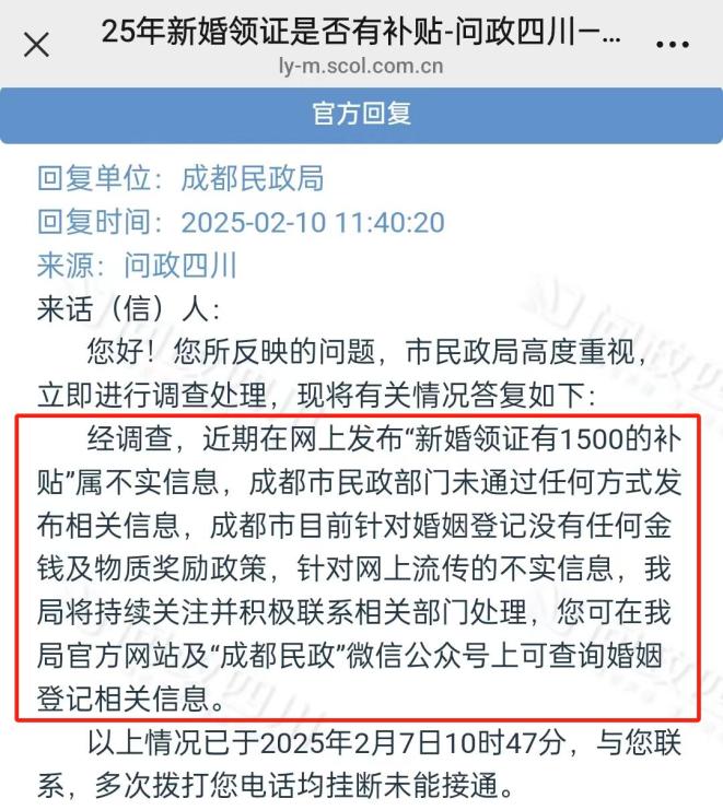 原标题:《成都结婚领证可领1500元?官方回应》