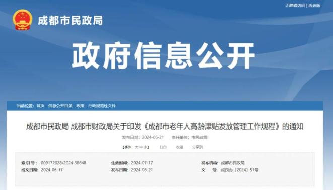 成都高龄津贴实行免申即享,对年满80周岁及以上成都户籍老年人自动纳入发放范围,在每月月底前通过“蓉易领·一卡通”发放。具体发放标准以户籍所在地政策为准!温馨提示