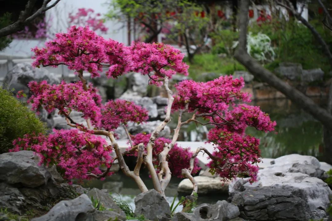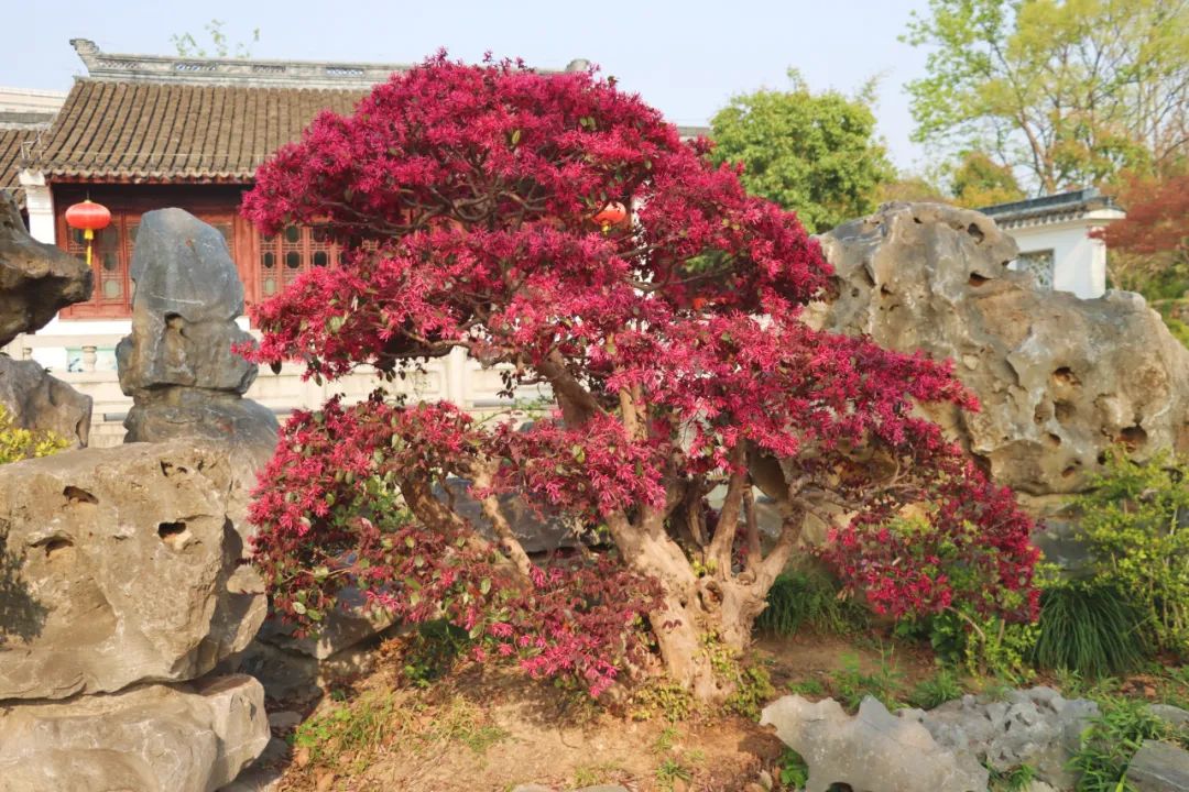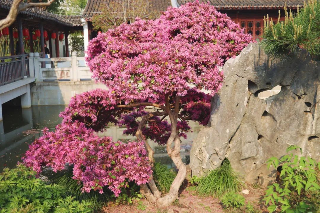 △点击查看大图△红花檵木是金缕梅科檵木属的常绿灌木或小乔木。新叶呈粉黛色系,随着季节的推移渐渐变为紫红色,花期时红花满缀,形成花叶共赏的独特景观效果。古猗园在打造“一木一景”时,常将池水畔、景石边的红花檵木通过修剪、蟠扎和吊拉等技法,塑造成临水式、斜干式等多种形态,既保留了自然神韵,又赋予了人工雕琢的艺术美感。