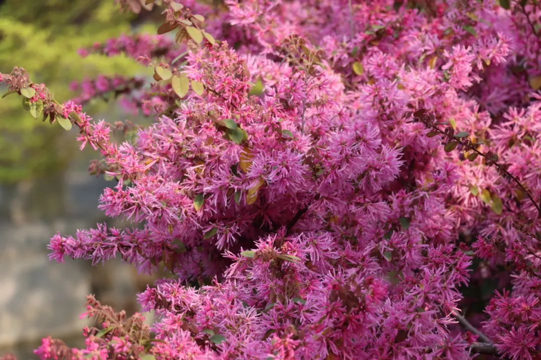 四月古猗园最出圈的不仅有牡丹,还有披着火焰斗篷的红花檵木,在万绿丛中分外耀眼。