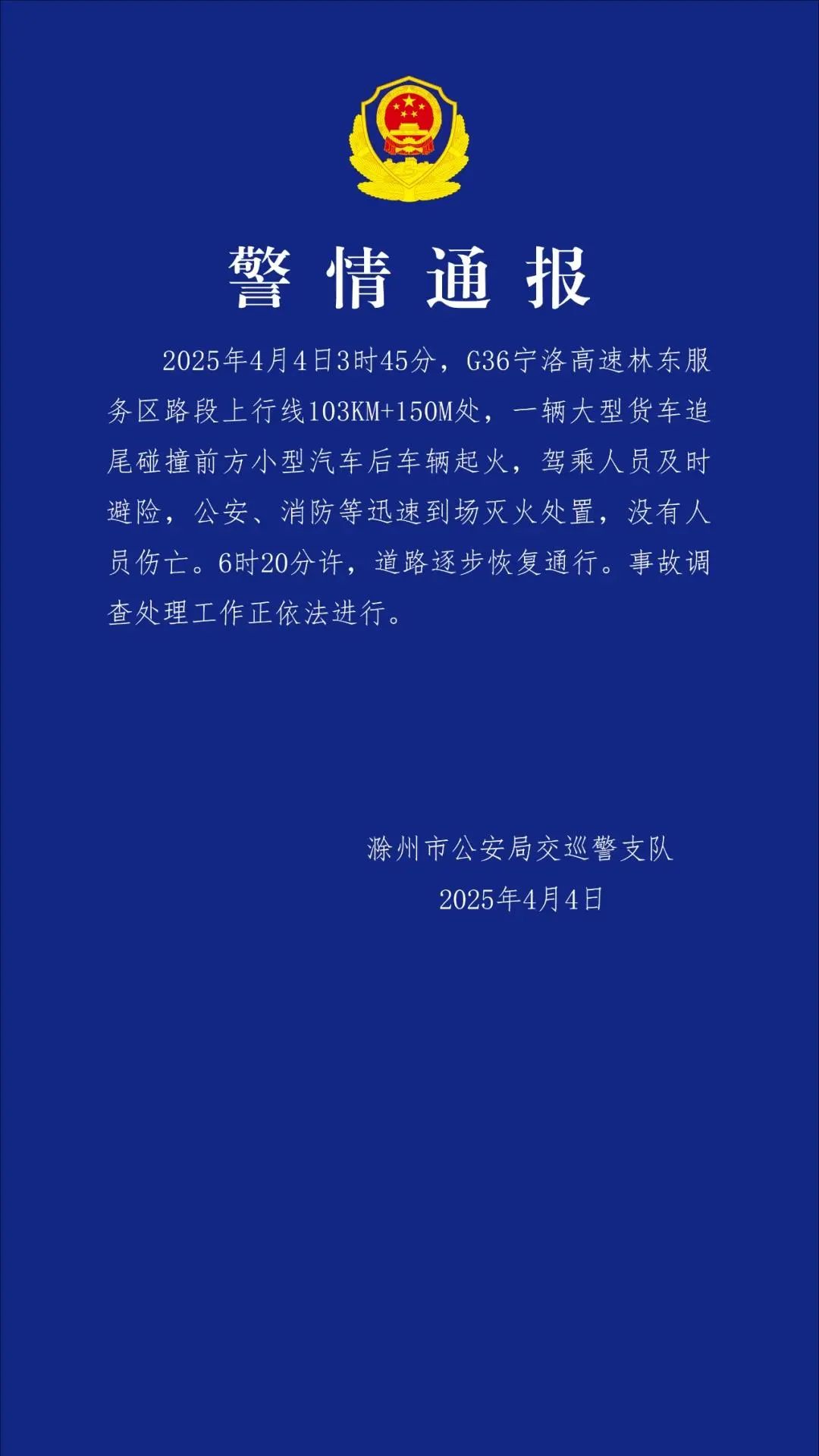 4月4日3时45分,G36宁洛高速林东服务区路段上行线103KM+150M处,一辆大型货车追尾碰撞前方小型汽车后车辆起火,驾乘人员及时避险,公安、消防等迅速到场灭火处置,没有人员伤亡。