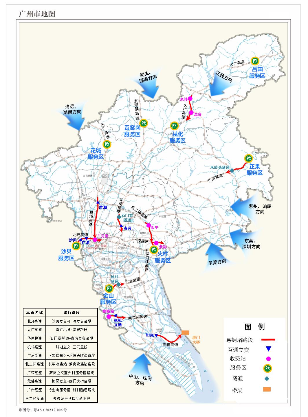 高速公路方面:返程高峰为4月6日下午15—21时。返程高峰期间预计大广高速、北环高速、广河高速、莞佛高速、广台高速广州段、广深高速等通道车流较繁忙。