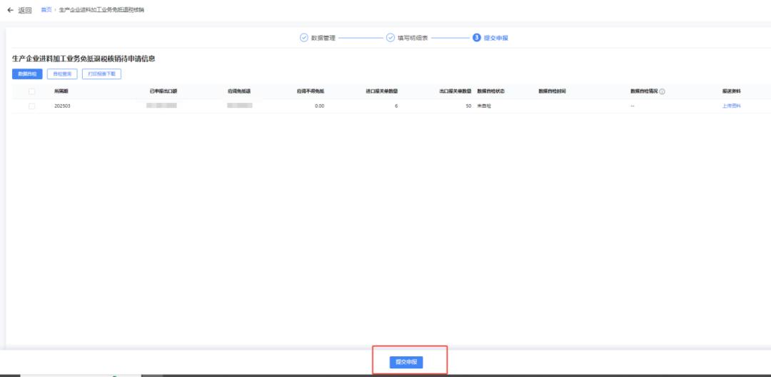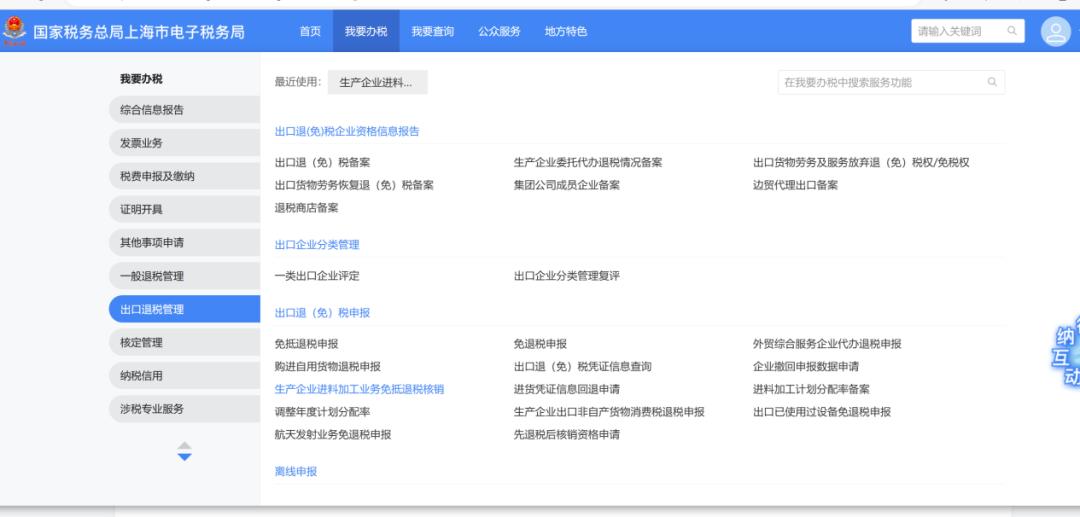 登录新电子税局后,点击【我要办税】-【出口退税管理】-【出口退免税申报】-【生产企业进料加工业务免抵退税核销】功能菜单,进入页面。
